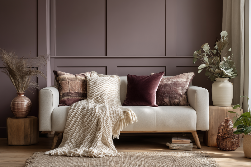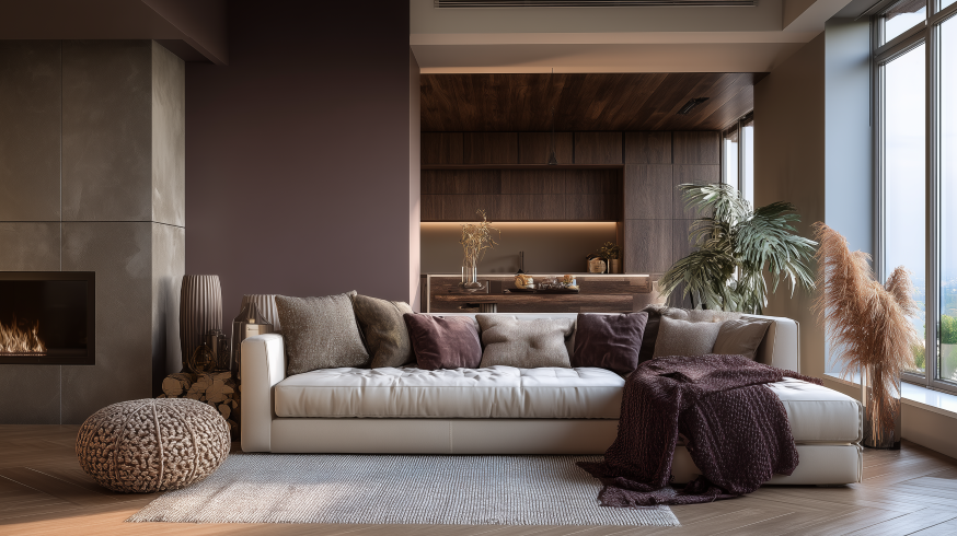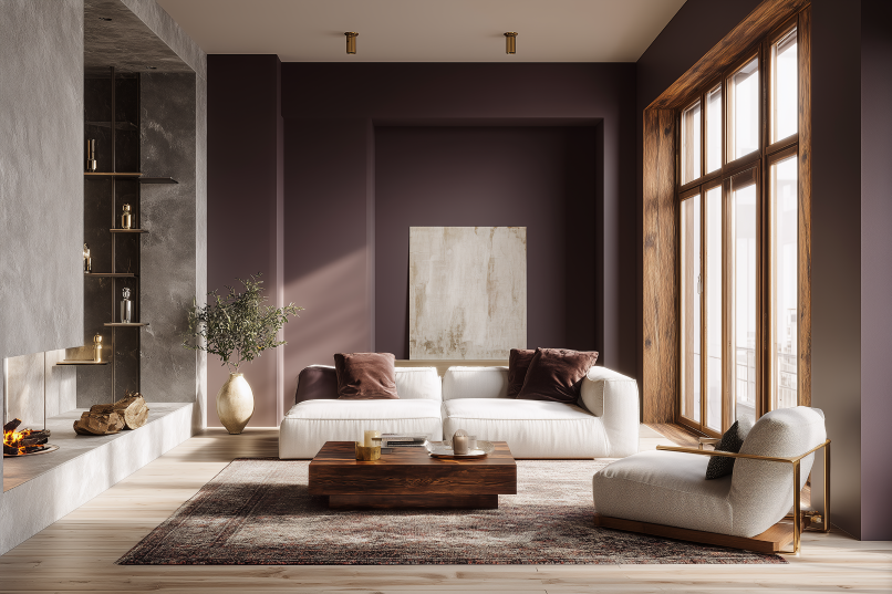 V obývacím pokoji lze Tajemnou švestku použít pro dominantní stěnu, například za pohovkou, u televizní obrazovky nebo krbu. Skvěle se hodí i k bytovému textilu: sametovým polštářům, dekám nebo závěsům. V obývacích pokojích ji lze kombinovat s teplými neutrálními tóny, jako je béžová, šedohnědá (taupe), krémová, ale i se dřevem (například ořech) nebo s mosaznými doplňky.