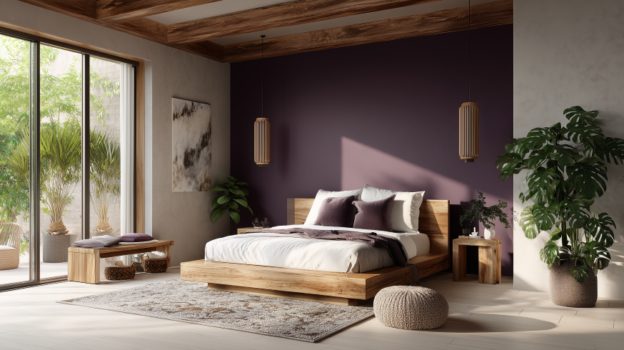 Tajemná švestka poskytne intimní atmosféru v ložnici na stěně za čelem postele. Nebo tuto roli mohou převzít přehozy, polštáře nebo závěsy v odstínu Tajemné švestky. Kombinujeme ji s jemnými texturami, jako je samet, teplé béžové tóny a černé kovové detaily.