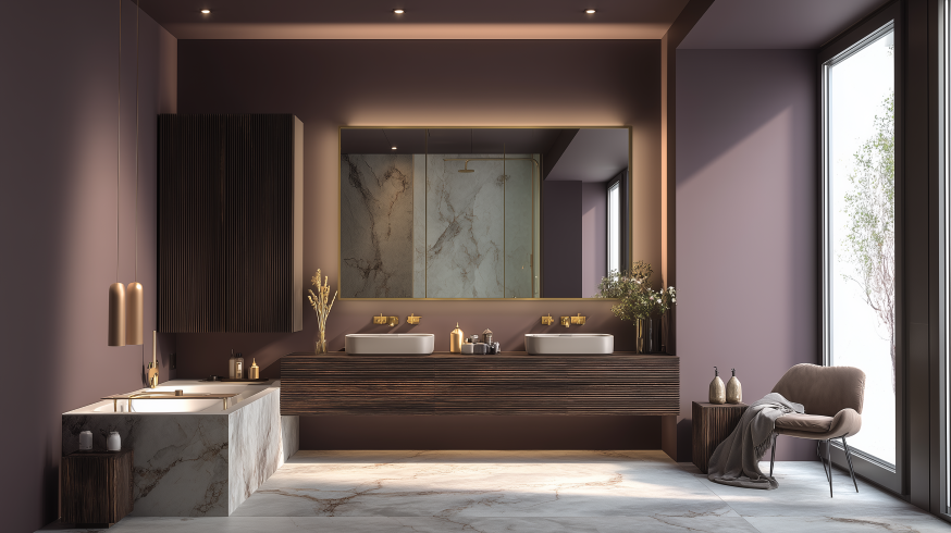 V koupelně lze barvu roku 2026 použít na skříňku pod umyvadlem, na menší stěnové plochy nebo vybrané textilní doplňky, jako jsou ručníky a koberce nebo košíky v tomto odstínu. Perfektně se hodí ke světle šedému mramoru, terazzu a černým armaturam, které dodávají moderní, rafinovaný vzhled.